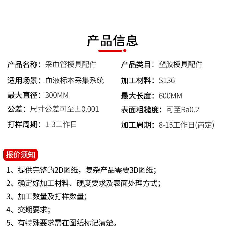 Home / Product Center / Mould Accessories / Medical supplies mold accessories-disposable negative pressure vacuum blood collection tube without additives tube procoagulation tube separation of rubber tube blood routine tube sedimentation tube heparin tube blood coagulation tube blood glucose tube nucleic acid test tube