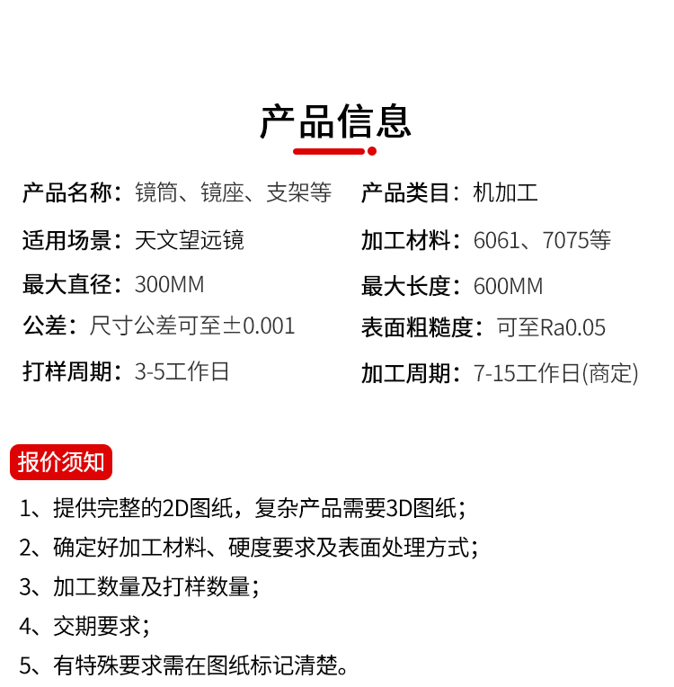 机加工类型: CNC加工中心 加工精度: 精整加工 加工材料: 铝合金 最大直径: 300 最大长度: 600(依产品复杂程度而定) 公差: ±0.001 表面粗糙度: Ra0.05 打样周期:1-3天 加工周期:7-15天(复杂产品周期商定) 年最大加工能力:7000000套