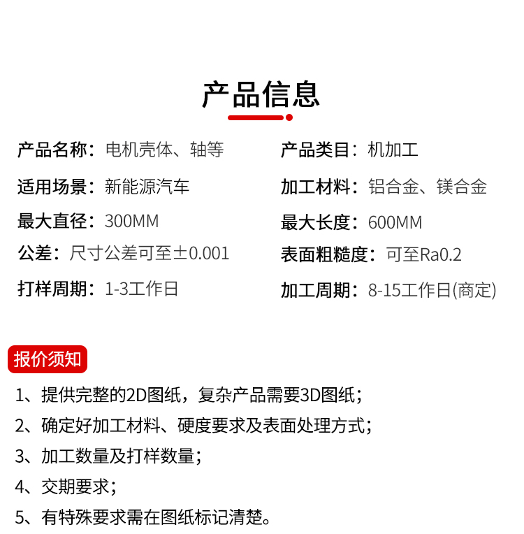 机加工类型: CNC加工中心、数控车 加工精度: 精整加工 加工材料: 铝合金、镁合金等 最大直径: 300 最大长度: 600(依产品复杂程度而定) 公差: ±0.001 表面粗糙度: Ra0.05 打样周期:1-3天 加工周期:7-15天(复杂产品周期商定) 年最大加工能力:7000000套